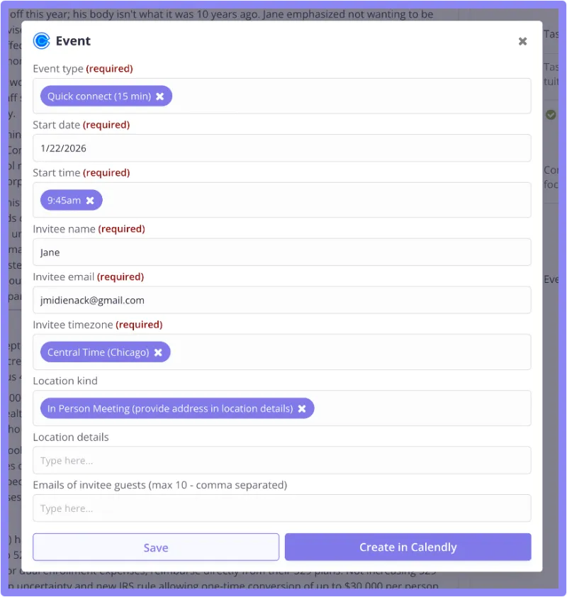 - If you schedule your next meeting with your client during the current one, and it is relatively clear that you agreed on a time and location together, Vega will automatically find the Event Type in your Calendly account that is relevant, and create a meeting invitation. Vega will take care of pre-populating every field (event type, start date and time, invitee email, location, etc.). You just need to review and confirm, like you confirm a CRM task or a worfklow suggestion, and Calendly will handle the pre-meeting flow per usual (invite, reminders, other pre-meeting workflows).