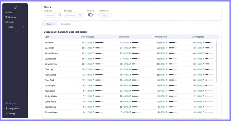 A dynamic usage report across all users at the firm and an integration status report are now available. This is a simple way to see how your team is adopting the Vega AI assistant across chat, email drafts, meeting notes, and meeting prep. Pick a date range (or filter to specific users) and you’ll get per-user usage counts plus the change vs. the previous period, so it’s easy to spot what’s working, where coaching helps, and the impact over time. A compliance report is coming soon, too!