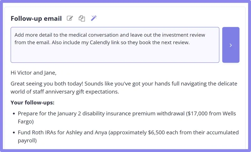 In December, we brought the follow-up email rewriting feature on par with the notes. Now, you can just tell Vega what you want in the email if the AI's initial version isn't perfect yet. Click the magic wand and type something like: "Add more detail to the medical conversation and leave out the investment review from the email. Also include my Calendly link so they book the next review."