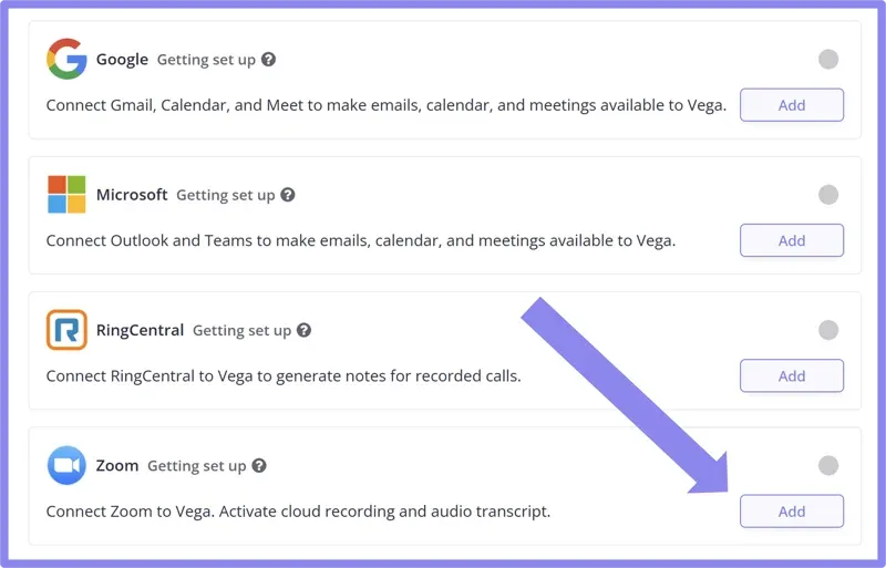 To activate this Zoom option, navigate to your Integrations page in Vega and click "Add" next to Zoom. If you already connected Zoom in the past, make sure you disconnect the integration and click "Add" again so the Zoom Phone scopes are added to your account.